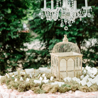 So much attention was paid to detail on this wedding. Birdcages filled with baby's breath and mini lights were hanging from the trees, guests signed little wooden hearts handmade by Julianne's grandfather then dropped into a shadow box in lieu of the guestbook. Potted plants in coral and white embellished areas throughout the yard. The place card table was draped with green moss and the place cards were nestled in alpa order. The table was placed beneath a crystal chandelier that was a gift to the bride by her aunt. The ruffled wedding cake with a coral sugar rose was placed on the baby grand piano in the living room of the house and all the guests enjoyed the toast and cake cutting. When you are married at the Hornsby House Inn there is a tradition with a very unique silver toasting cup...it has a large cup and very small cup under each other....the bride and groom toast...drink out of the cup at the same time ...one drinking out of the larger cup and the other out of the smaller..who ever spills the champagne the other gets to spank!!!! David Hornsby owner of the home tells this story so wonderfully. He says every couple who has been married in the home stays married forever!!!!